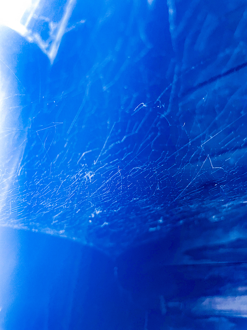 “Let me first say that I loathe spiders. Absolutely abhor them. I cannot bear the thought of them. So, the only way I could approach this KA was to focus on the potential for beauty in the cobweb—not where they come from, not what they home—but some abstract, ethereal concept of cobweb that has absolutely nothing to do with spiders. I focused on those autumn mornings when the hedgerows are draped in white silk, loosely woven in networks of lines and geometric shapes, encrusted with a zillion sparkling dewdrops. Then I imagined this beautiful, bejewelled material, moulded into gorgeous organic shapes and given new meaning as a thing of joy. I worked to achieve this with yarn, hooks, beads, balloons, glue, and a hairdryer, and submitted the finished images to KA—only to have Phil email me (and I quote): ‘I really think some of these are the essence of ‘spider’!’”