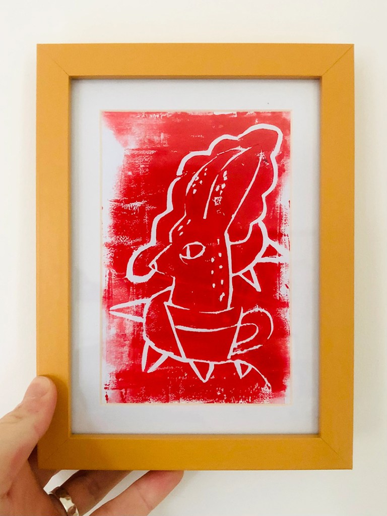 “As we find ourselves racing headfirst into the spooky season, and with the latest Kick-About prompt being ‘Cobweb’, I decided to spend a few Sunday hours paying homage to Jordan Peele’s horror genre contributions; some of my favourite modern horror. Armed with my prompt and accompanying inspiration, I mocked up a quick design incorporating Get Out’s teacup, Us’ haunting bunnies, and the looming clouds from Nope—carved into some Lino, drenched in a fitting red and got to printing…”