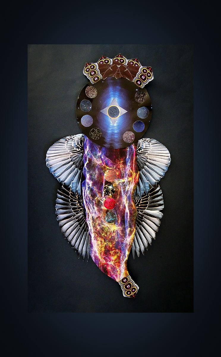 “I was unaware of the Hopi Winter Solstice celebration, Soyal, until I started wandering the internet for ideas for this prompt. Soyal welcomes the Kachinas from their home in the mountains as they bring the sun back to the Hopi people, “establishing a new life for the world.” I’ve always been attracted to the Kachina spirits and the doll-like figures and costumes created by the Hopi to embody them. They represent animals, plants, the elements, the landscape, the cosmos, and the weather—essentially all aspects of life. Feathers are prominent in their design. The actual ceremony is secret, and the complex symbolism of Kachinas belongs to the Hopi belief system. However, I see a connection with the birdlings and decided to use the Kachina spirits as inspiration for some Solstice birdlings. The Black Plumed Serpent is central to the Solstice ceremony, so I created one akin to a winged dragon. I’m also really drawn to the Chasing Star Spirit—both for its association with the cosmos and because the Hopi also have a Blue Star Kachina. The Blue Star Kachina is prophesied to appear and signal the beginning of a New World after this one is destroyed by humans. A spirit of rebirth feels fitting for the return of light and the New Year. The birdlings I made are Falcon (symbolising the sun), Crow Mother (the Guardian of Children), Owl (the keeper of wisdom and the night), and Hummingbird (the messenger). I also incorporated butterfly wings (healing) into each one.”