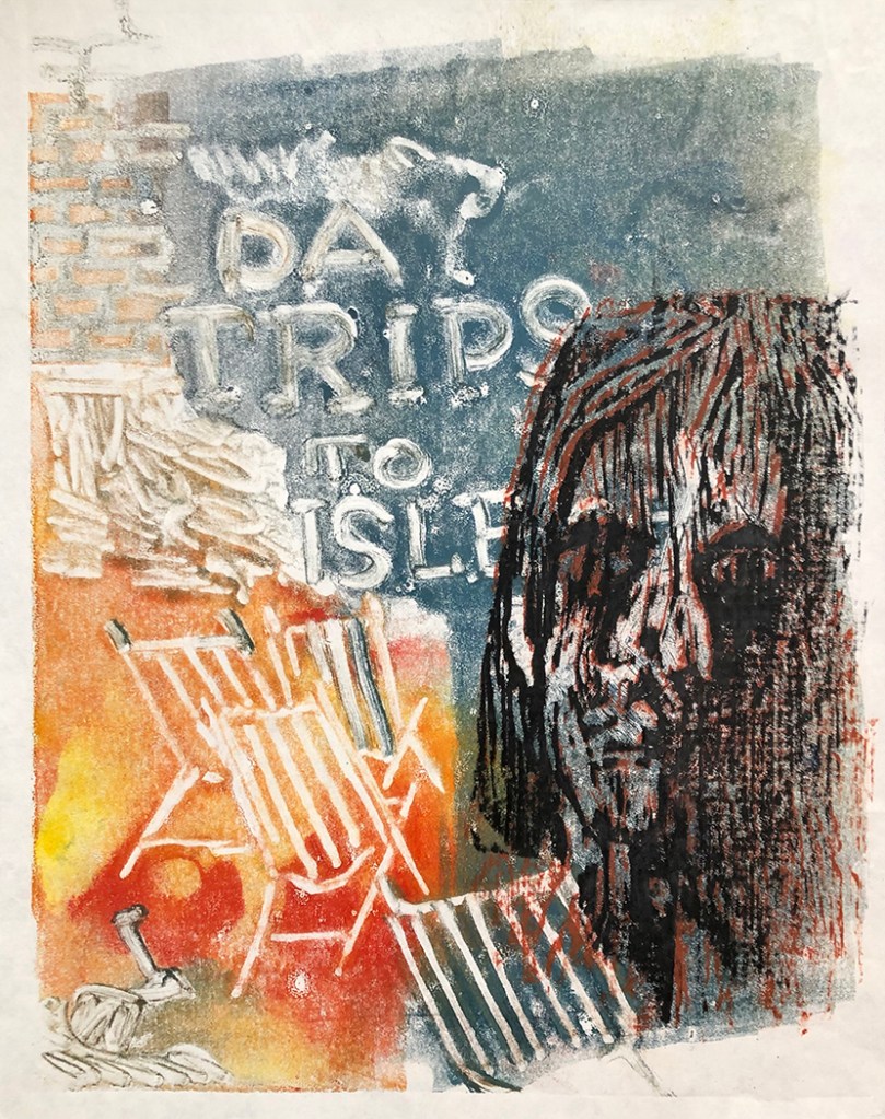 “This monoprint was made after a trip to the Isle of White 1969. It was for the first music festival in this country, with Bob Dylan, The Rolling Stones, The Who, and many more over a three day period. It was terrifying and exciting in equal measure but I decided these vast gatherings were not for me!”