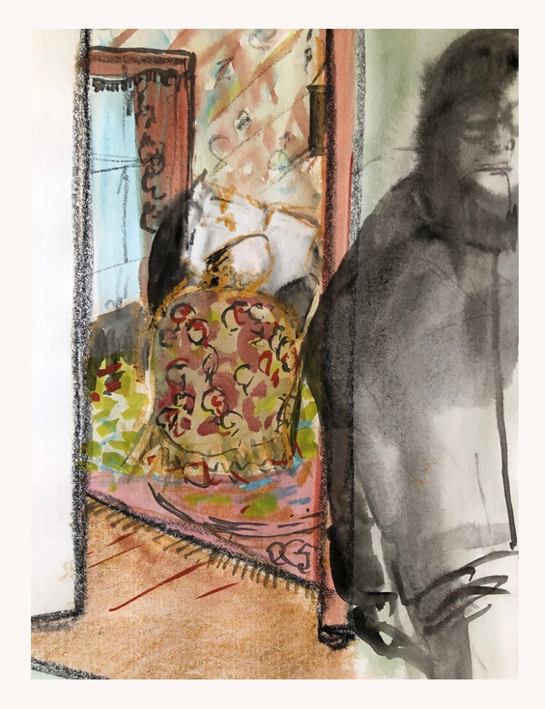 “The only times in my life I have ever attempted a self portrait in any form seems to have occurred at times of stress and confusion. It really isn’t something I yearn to do. However, I dug around in my past and found these odd drawings and prints I had done since leaving school and art school . Some had been motivated by an event in my life like the death of my father. Some seem to be me reflecting on my situation at that time whether about the end of a love affair or just plain confusion as in my bed after a restless night in Spain. The most recent one was just before COVID really hit us.“