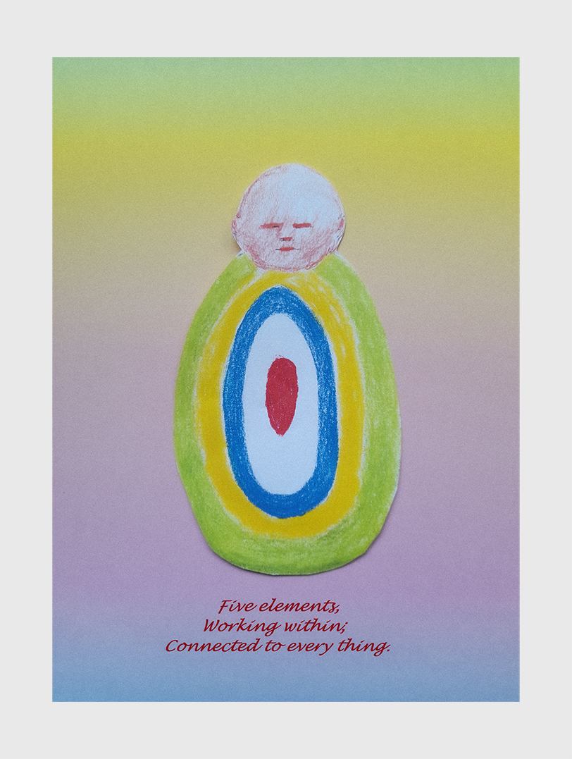 “Iridescence is a phenomenon that occurs at the surface of an object, like soap bubbles on water for example, but we don’t see what is going on beneath the surface. As I have been reading recently about the Five Elements of Chinese medicine, I was intrigued with the idea that they are represented by colours. The elements are: Metal; Water; Wood; Fire; Earth, and are related to the lungs, the kidneys, the liver, the heart and the spleen respectively. The colours are white, blue, green, red and yellow, respectively. We really don’t think about what goes on within our bodies but they work and we live our lives and just like the bubbles, we are also a phenomenon and connected to each other and everything.”