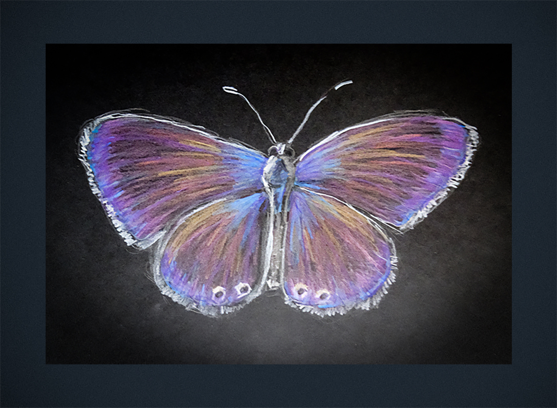“I tried iridescent paint, pencils, crayons, and gel pens in various combinations and configurations–not one resulted in a piece of art that looked iridescent. Still, we know butterfly wings are iridescent, right? That’s what imagination is for.”