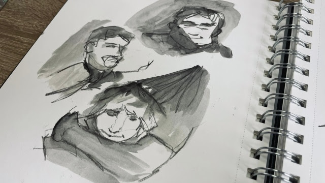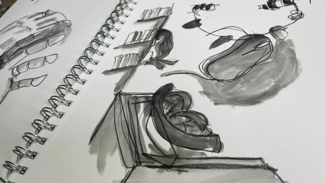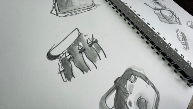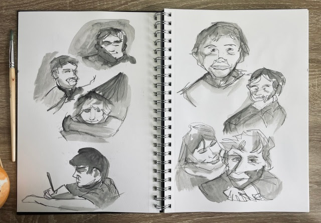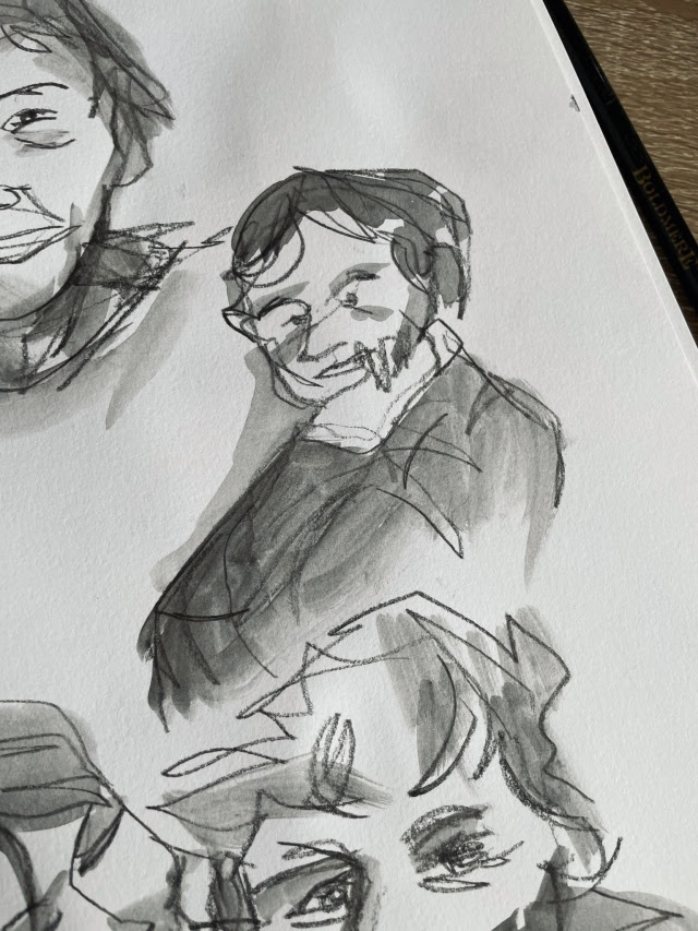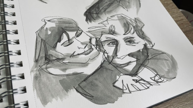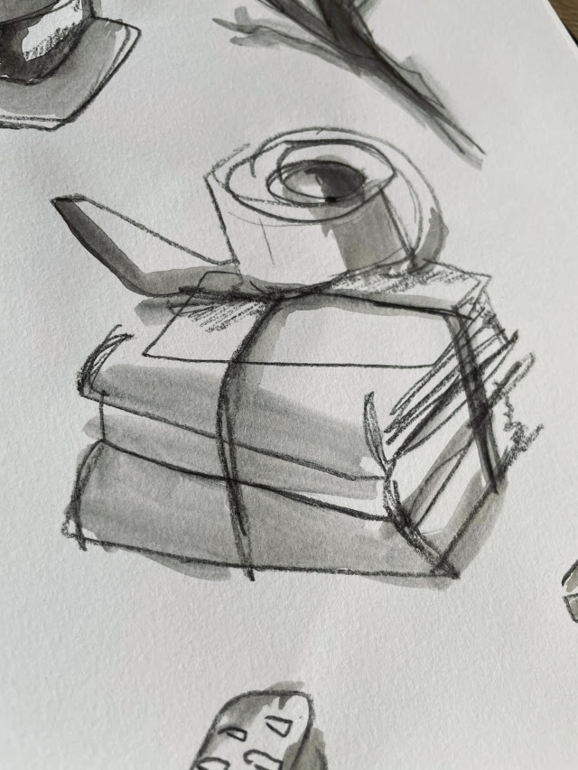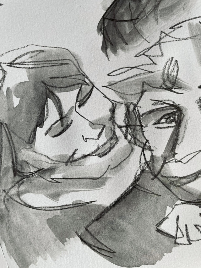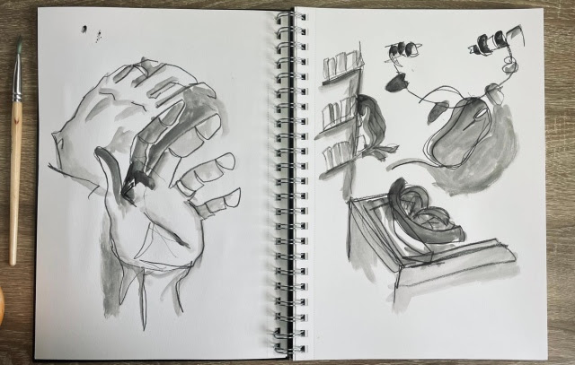 “When I think of iridescence I think of the glossy glare that my brain has attached to looking through the childhood photographs that fill box upon box in my mum’s attic, and the way that their angle in your hand often shifts or distorts the subject into an overexposed, fuzzy moment in time that’s changing in real-time. In short, iridescence makes me think of events that feel both incredibly familiar and oddly out of reach. A room that you half-remember walking into at some point in your childhood but can’t for the life of you remember who the person pictured next to you is. To replicate the idea of something feeling buried in the depths of your memory I decided to fill some sketchbook pages with blind contour drawings and a simple wash; using childhood photographs as references to work from once I’d warmed up by sketching the trinkets around me. Resulting in gestures that feel like memories you can almost relate to, clips of recollections that keep jittering out of reach.“