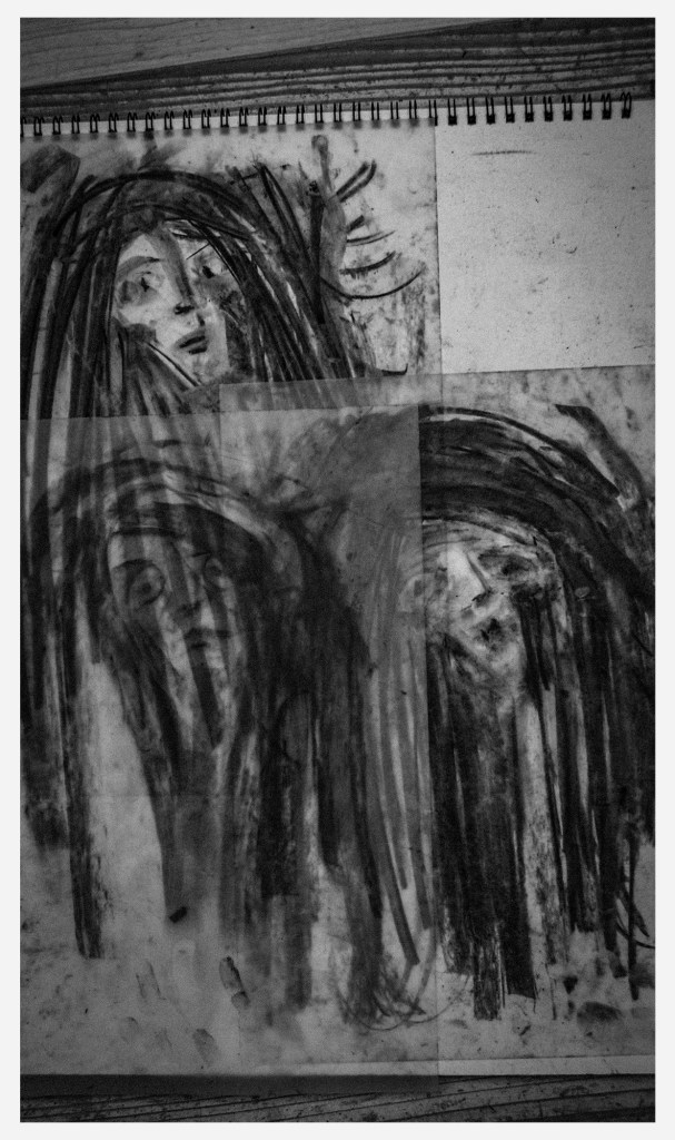 I don’t draw really, but I decided I’d just begin something by using charcoal on tracing paper to conjure up some expressive faces – three witches as it turns out! The idea to make a film followed soon after, which saw me mucking about with crushed charcoal and some stop-frame animation.