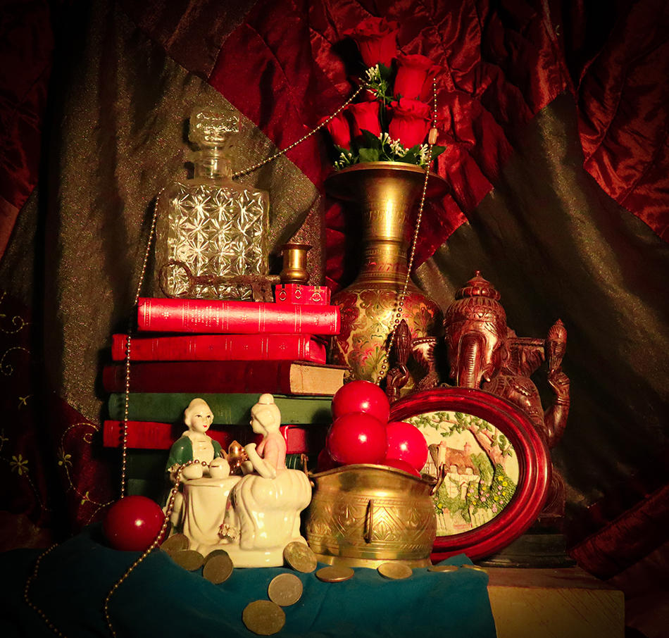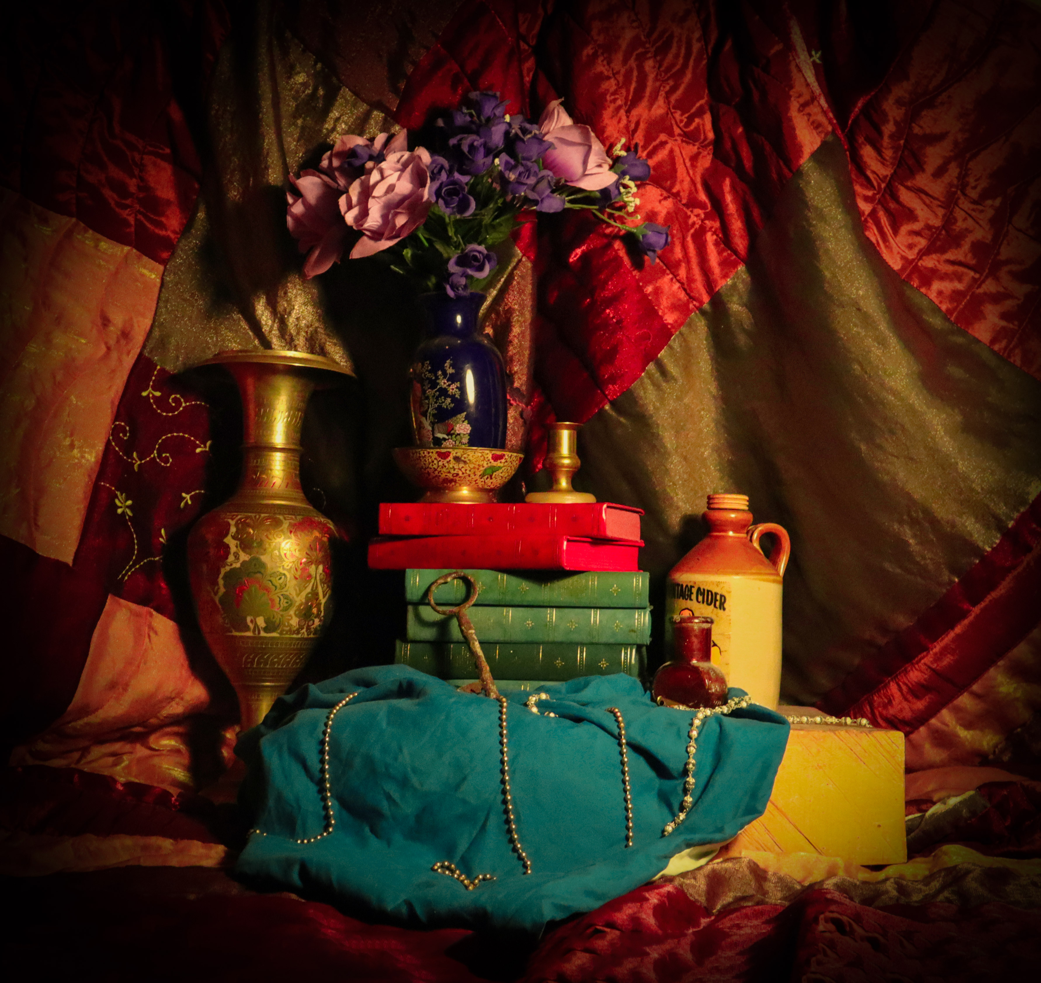 “These are some of my ‘treasures’… The first fits more appropriately in the ‘trove’ of our prompt, as the spectacle case was found on a wall in France and was subsequently used to house the stag beetle and maybug, which were also found. As I have an endless fascination with all insects—and have spent years drawing them—these are in a particularly precious drawer. The purse was bought in a jumble sale. I added the glass jewel (from a distant friend of my mother) and it holds a brass ant(?) given to me by my aunt who recently died. Not having these ‘on show’ means that when I find them tucked away and open the case or purse they once more become ‘treasure troves’ again and again…”