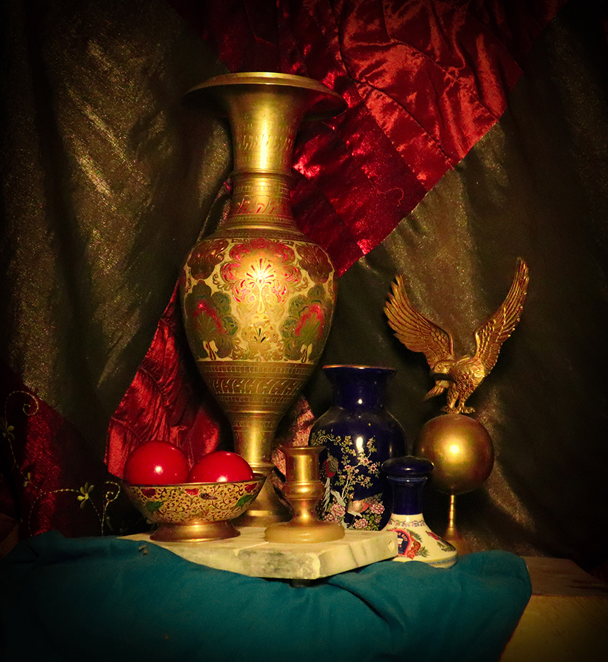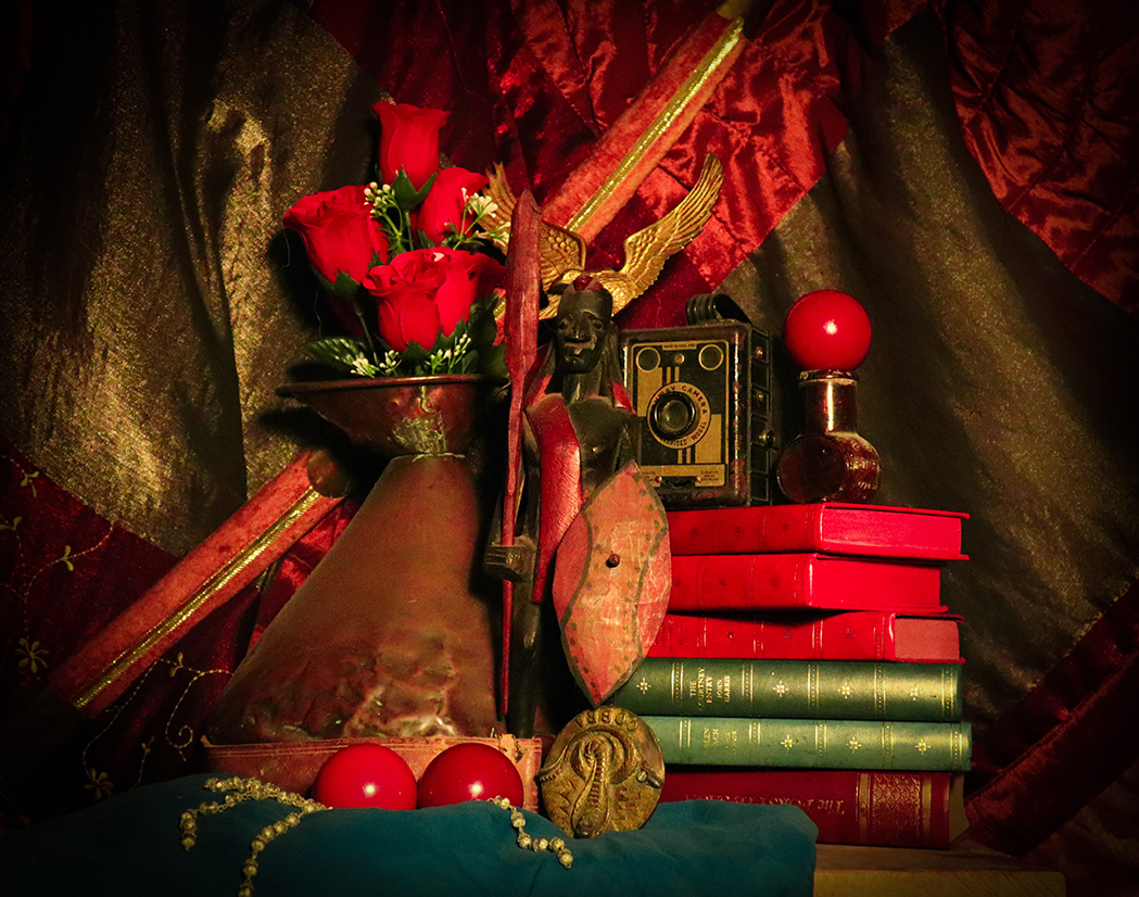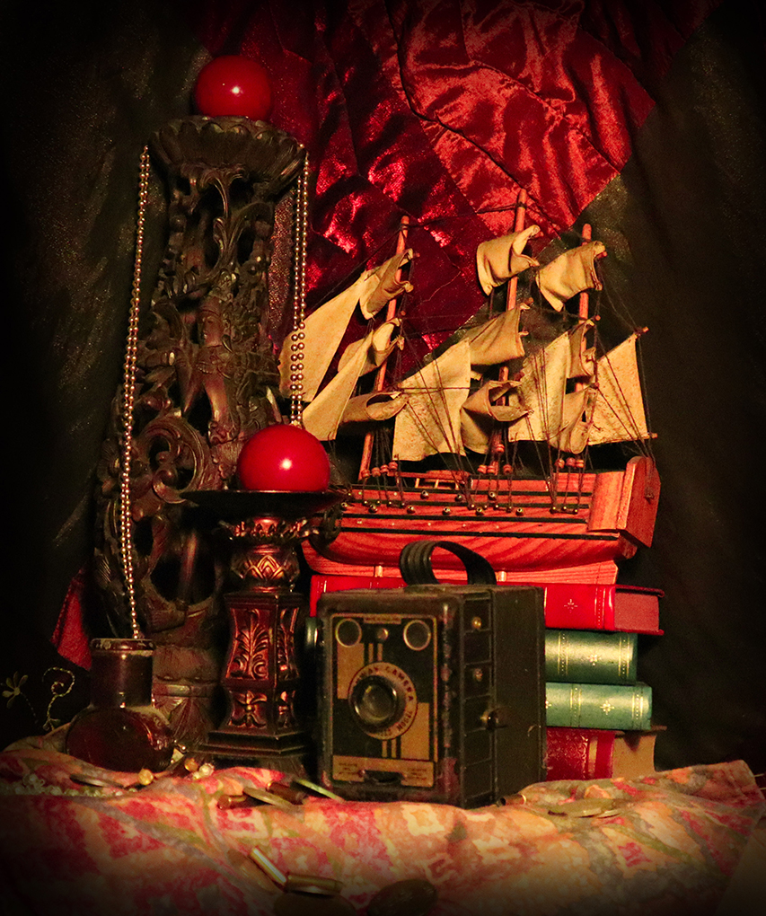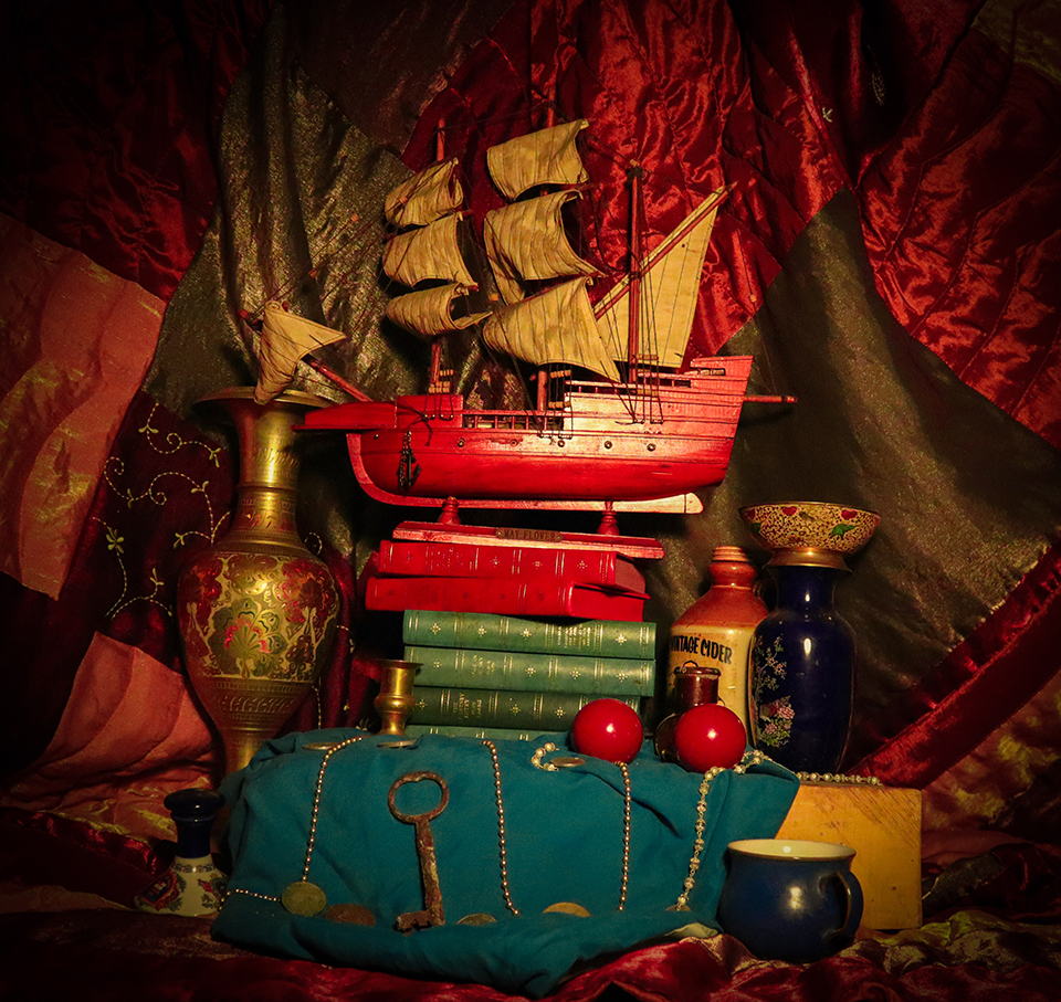 “My niece and I were both watching a favourite film of ours—The Goonies—and one of my favourite scenes is when the group of friends find treasures of every sort hidden away in a pirate ship deep within a cave. The glistening gold, colourful jewels and shiny ancient things made me think of my Dad’s house and all the collectibles he has perched on top of something else—with a story for each. I decided to capture some still life photography of my Dad’s trinkets by prop styling them in a suitable manner and lighting them to capture the light and shine—almost as if The Goonies happened upon these findings with their flashlights.”
