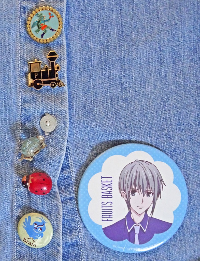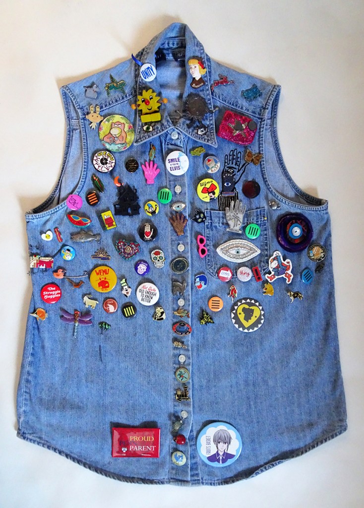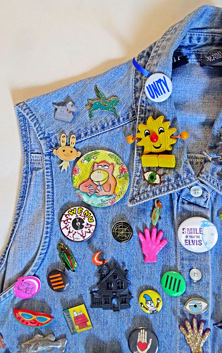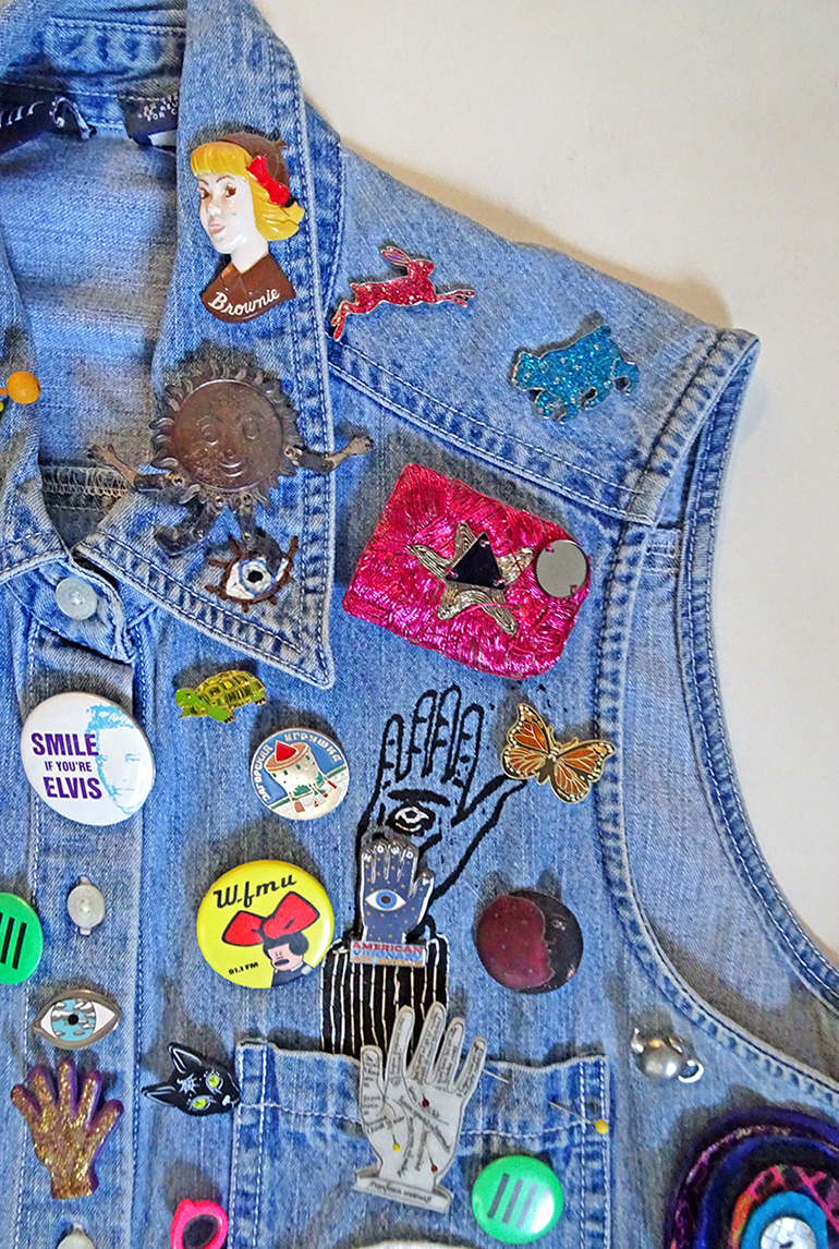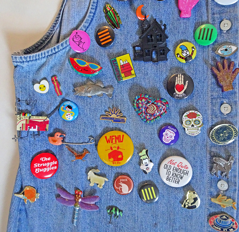 Connections to my past: my Brownie pin, my nephew’s band, the FM station I listened to for years. Handmade pins created by friends, my mother’s glitter, my children’s discards, a NYC marathon pin from my sister-in-law.