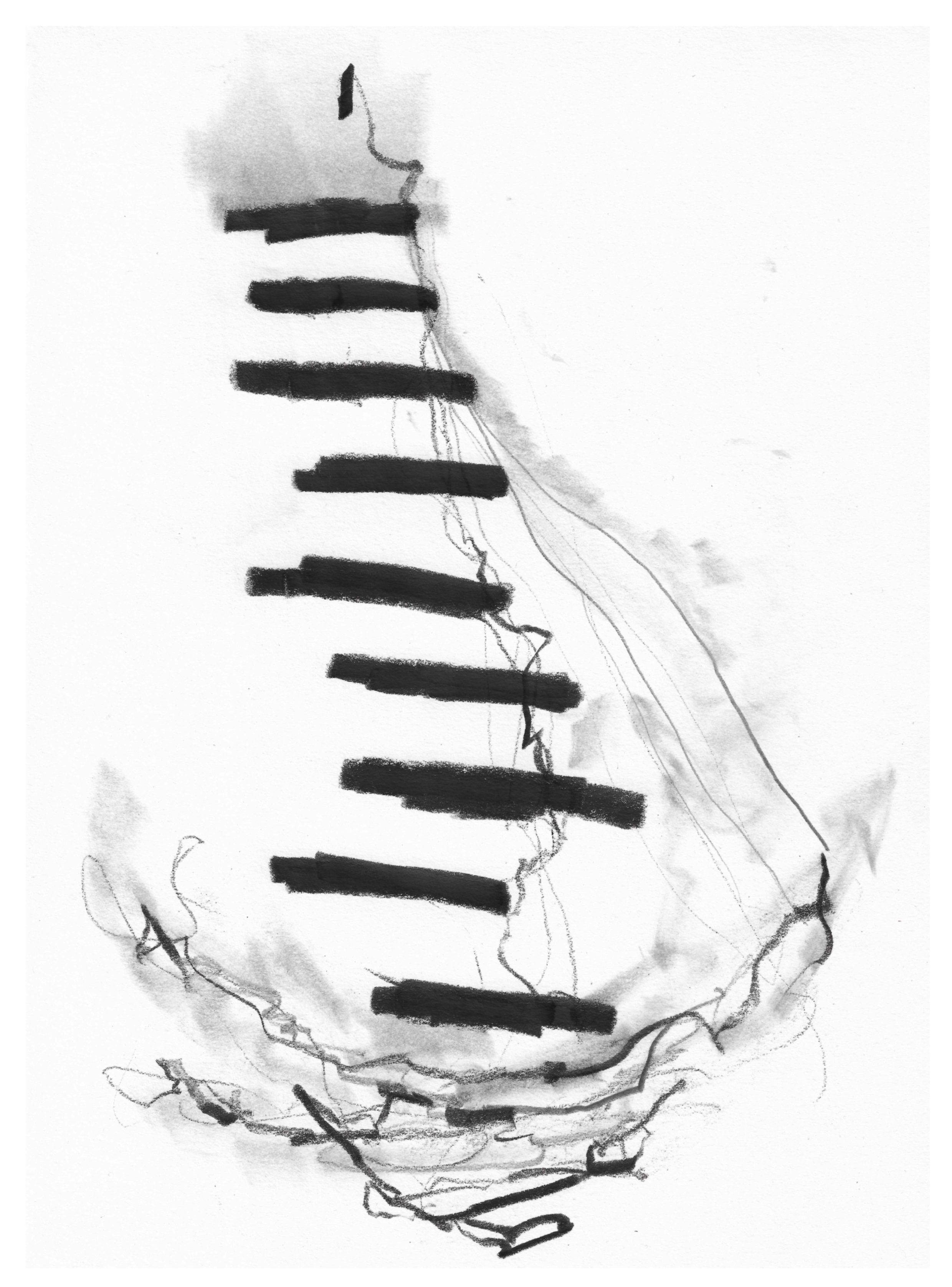 “I wanted to explore the circular staircase inside. I tried a collage but it went nowhere, so I did a series of monoprints and then, as I so often do, I cut two of them into squares to make a grid.”