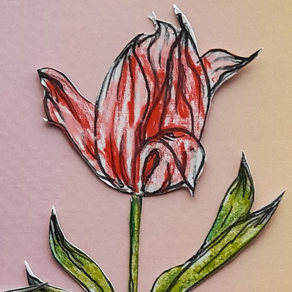 “It was the piercing crimson of the Semper Augustus that first peaked my creative interest. I found myself particularly interested in the idea of layering colour on top of my typical semi-blind graphite drawings—in hopes of articulating an element of the intimidation that I thought present in the petals of the broken tulip. First off, I tested the water with a simple drawing made from a flower I found whilst exploring over the weekend, before finally repeating the process with an added layer of red to finish the pieces.”