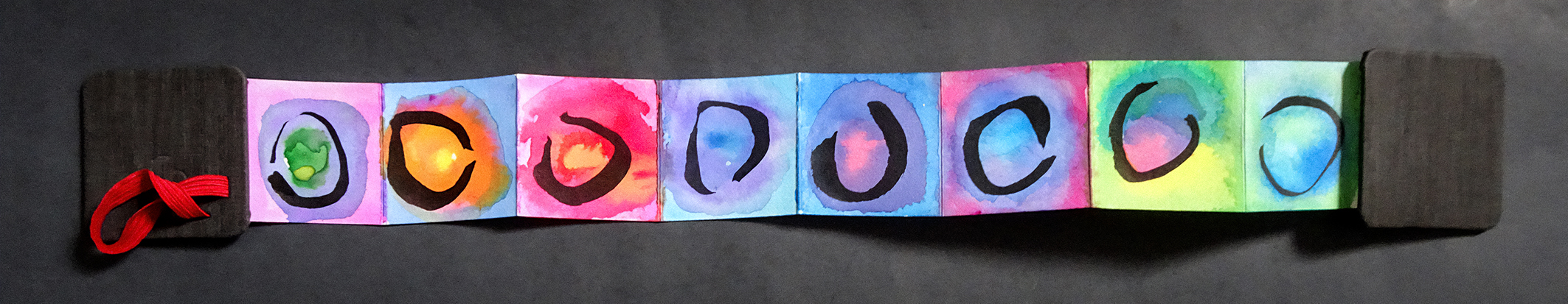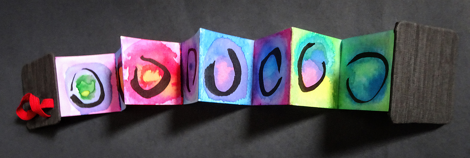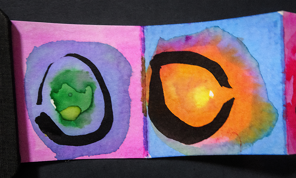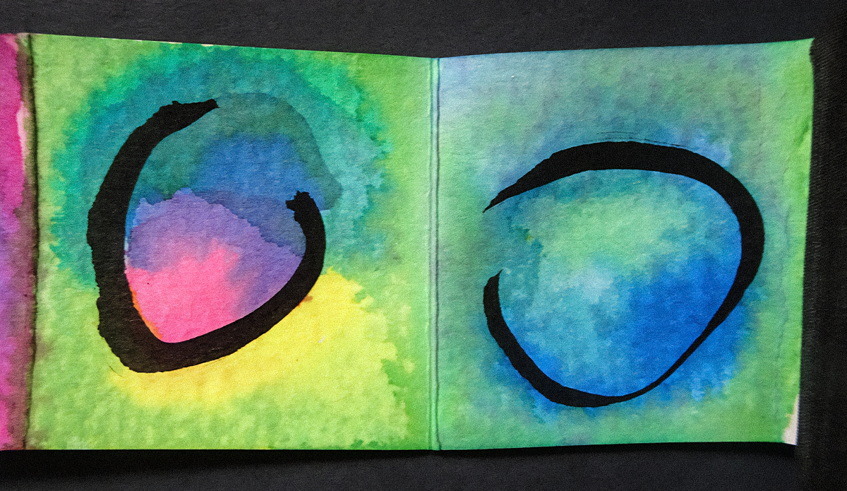 “My sister-in-law gave me a tiny accordion book a while ago which I immediately filled with ensōs. But I was not sure what else to do with them. Turrell’s circles of light fit them perfectly. I was also intrigued by his structures, and did a few collages inspired by them. I’m sure I will return to this idea in the future as it is reminiscent of the shadow collages I’ve been doing. And a little poetic commentary.”