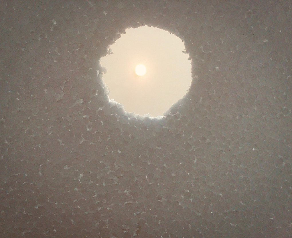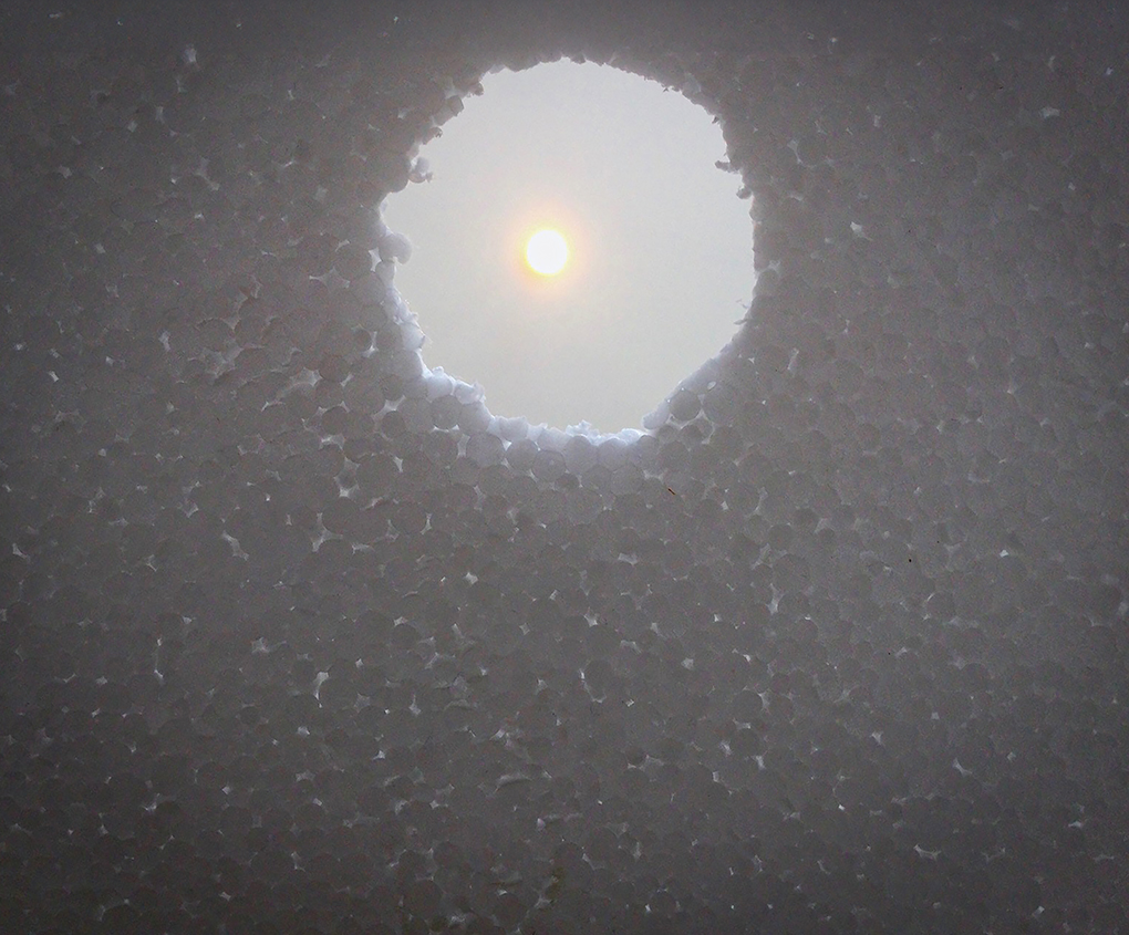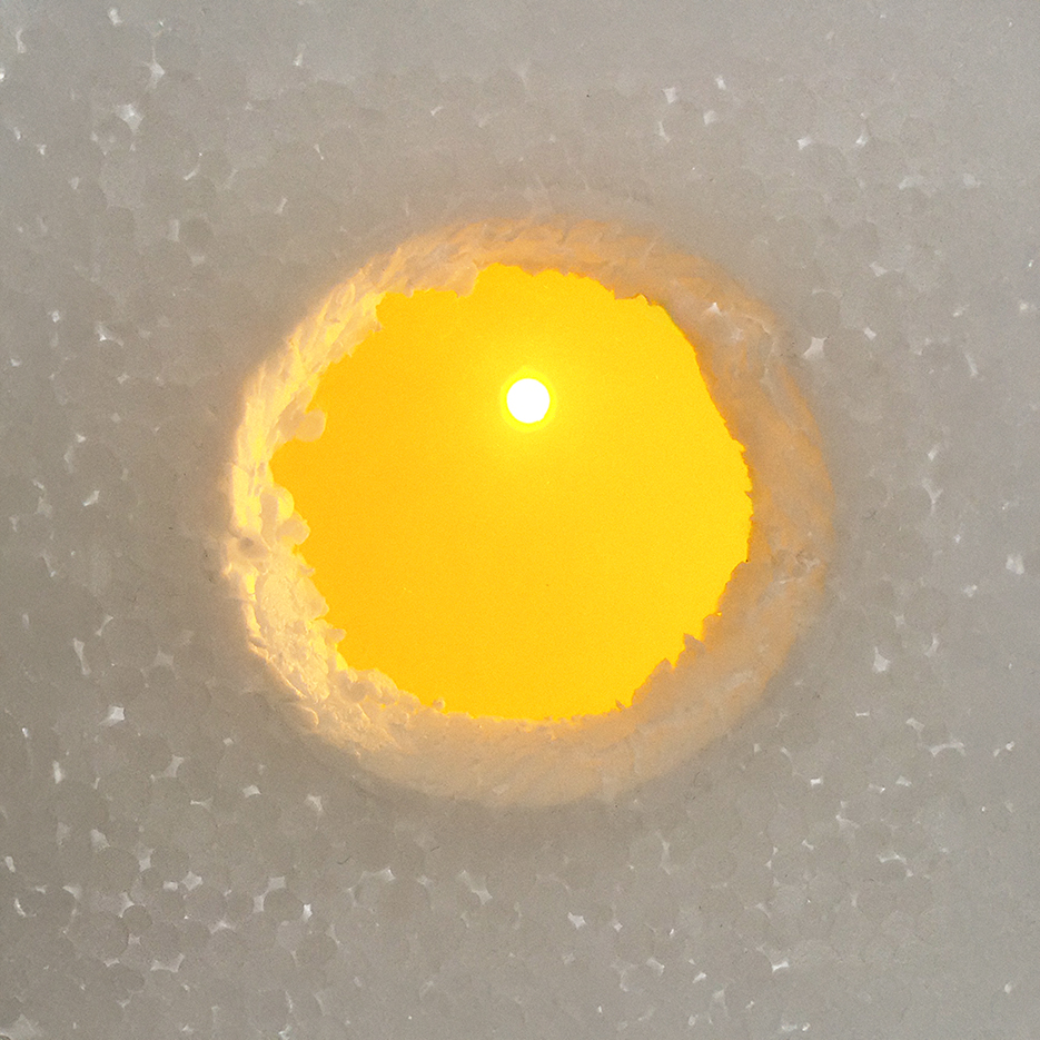 “This was a challenge and required a great deal of contortion as I balanced a piece of polystyrene with a cut out hole and a yellow filter placed over that balanced between a chair and a table with a gap of 9” between the legs to wiggle through on my back, hold up the iPad and get the photo! What I based it on was the stunning ‘room’ Turrell created with a hole in the ceiling, so that the sky was framed in a white surround… so viewed lying down. Mine was in my studio looking at the bare bulb. Bit crude in its execution but reminded me of what it might be like looking out of a hole in the snow or an igloo at various stages of the day.“