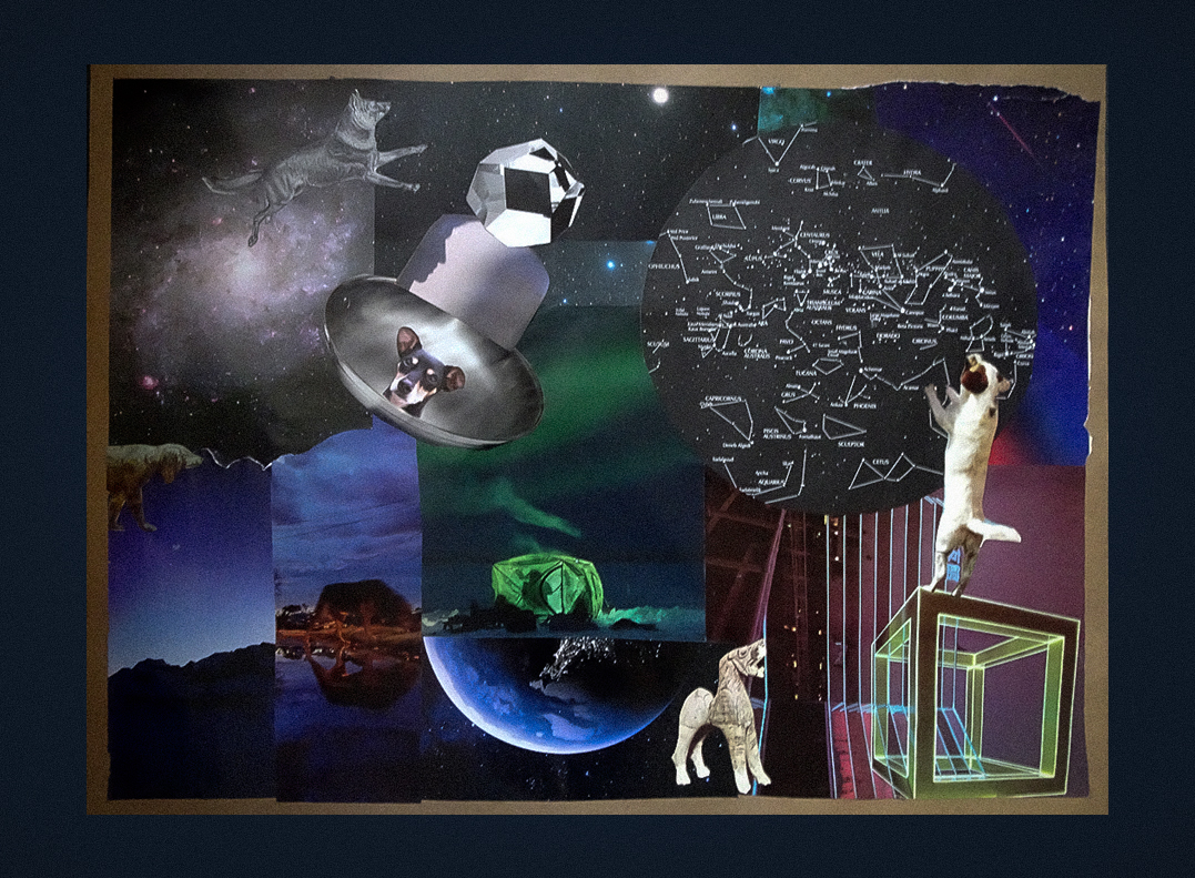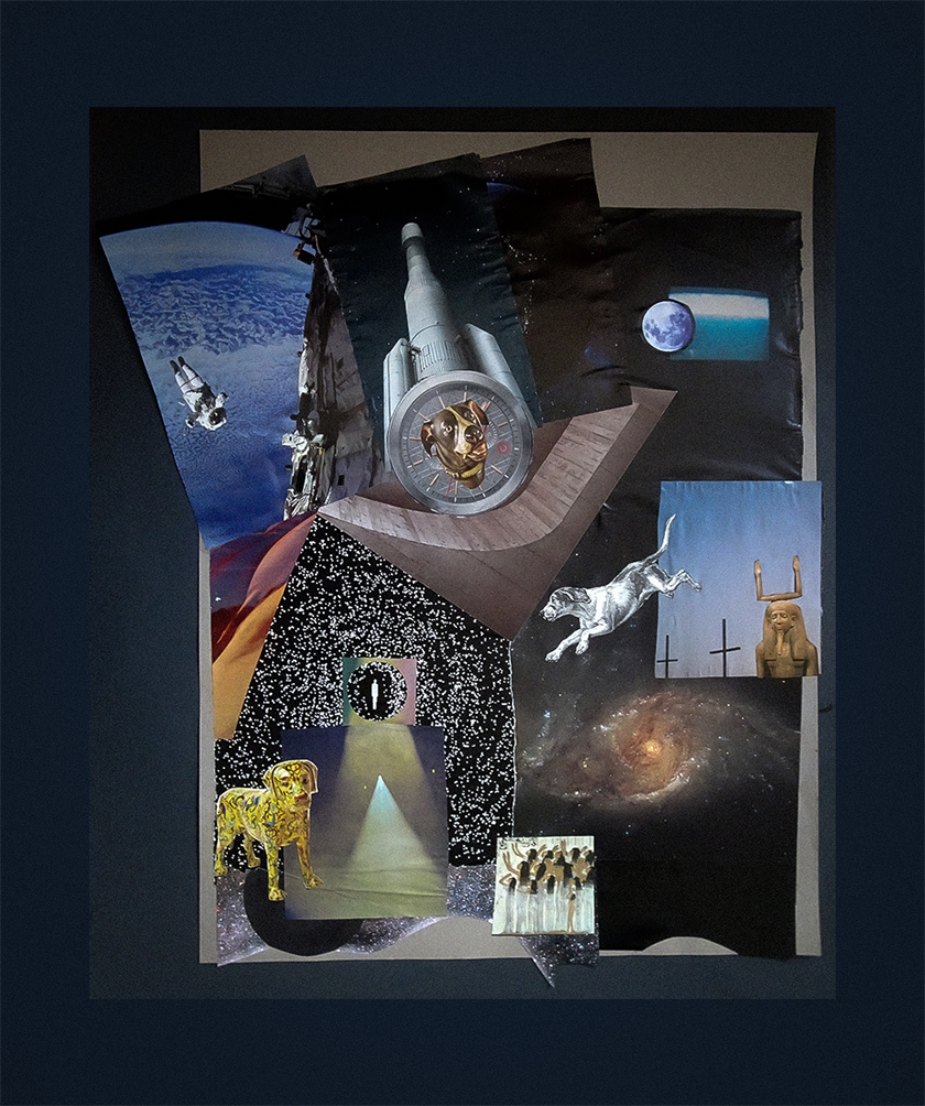 “When I saw that the prompt this time was Sputnik, I immediately thought of a graphic novel by Nick Abadzis that I read a few years ago—’Laika’. It tells the story of the dog Russia launched into space as a way to score propaganda points in the Space Race with the U.S. Because of Khruschev’s demands, there was no time to work out a re-entry plan for Laika. She was considered collateral damage to the political agenda, as so many living things are, it seems, and have been throughout human history. The story continues to haunt me, especially after viewing a photo of Laika strapped into the tiny space she occupied inside Sputnik II. I like to think her spirit joined the celestial dog spirits who are said to guide souls on their journey to the afterlife. That was the inspiration for my collages and poem.”