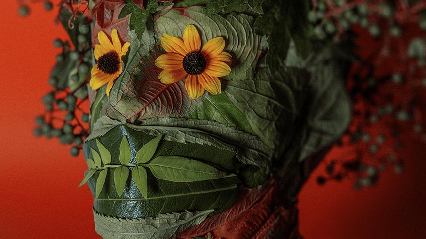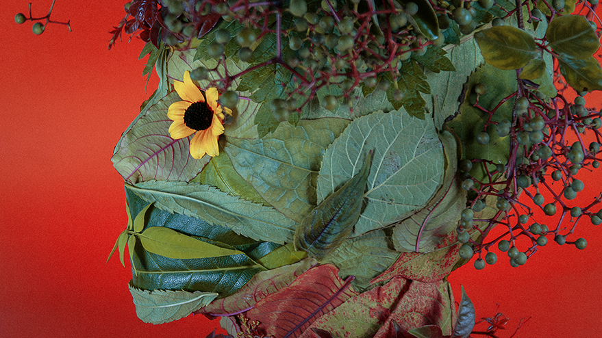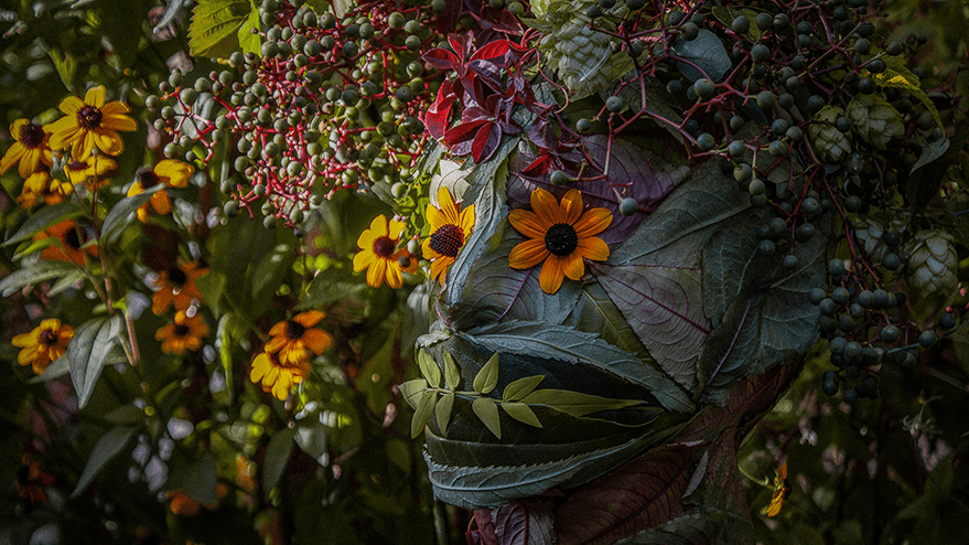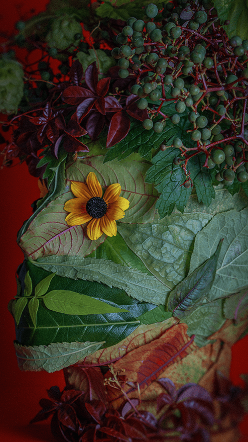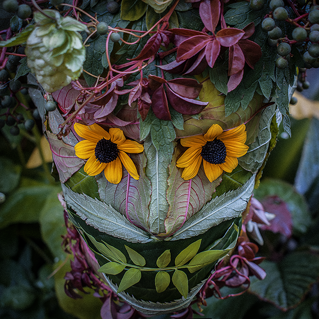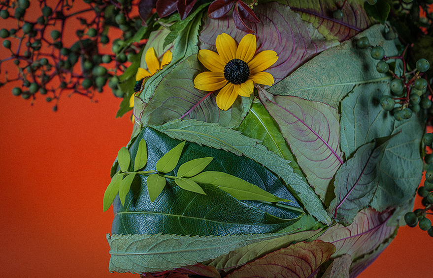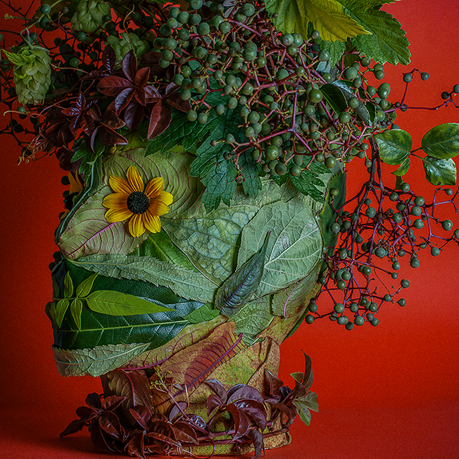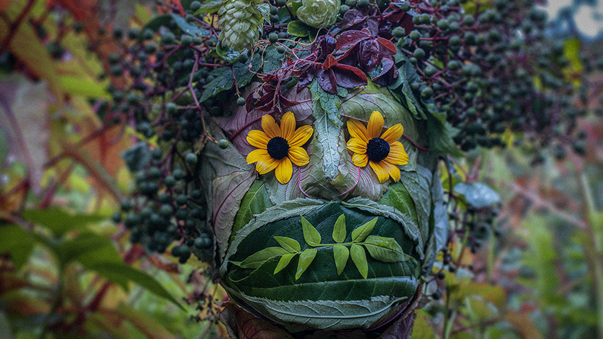 The leaves were harvested quickly—because it was about to rain—and this Vertumnus-inspired head was started and finished in just under thirty minutes. Early next morning, I took him out into the garden and photographed him in his element. Admittedly, it’s all a bit more ‘Midsommar’ than Arcimboldo!