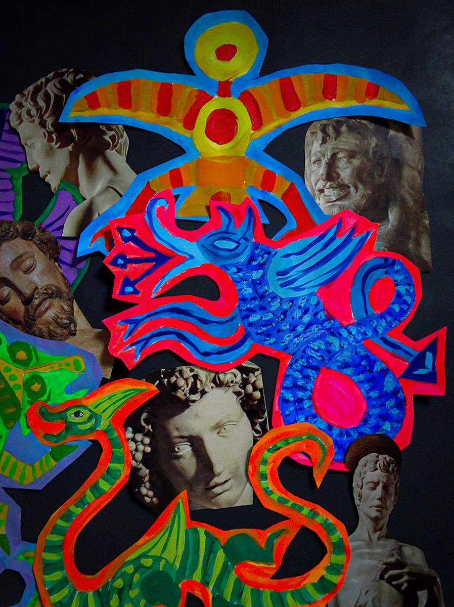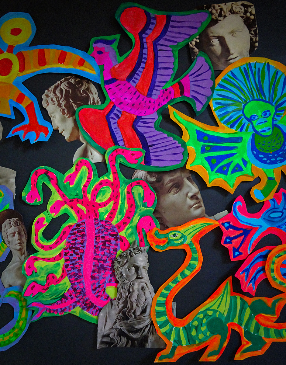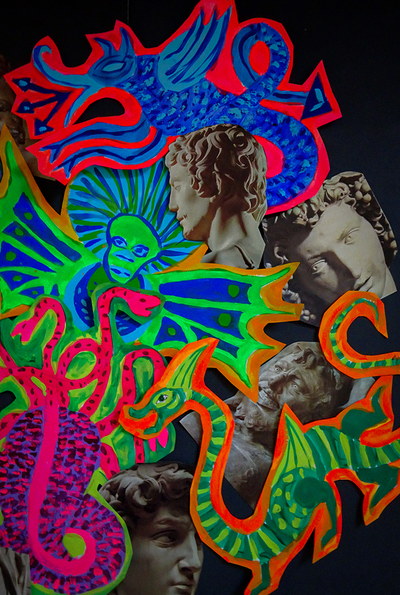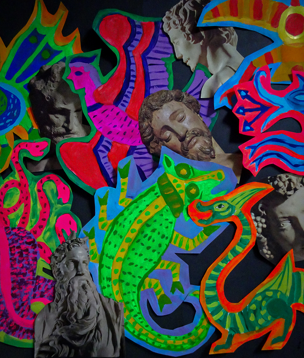 “I decided to paint some beasts in fauvist colours, inspired by Dover’s Treasury of Fantastic and Mythological Creatures, which I then cut up. I didn’t have any Donatello references, but figured Michelangelo would serve, so I scattered some of his heads among the beasts.“