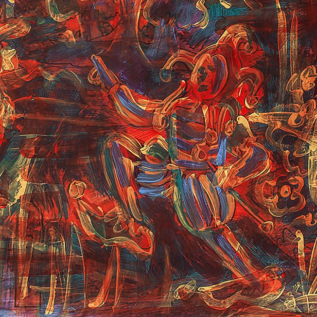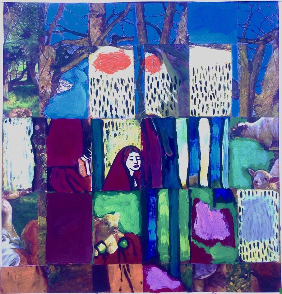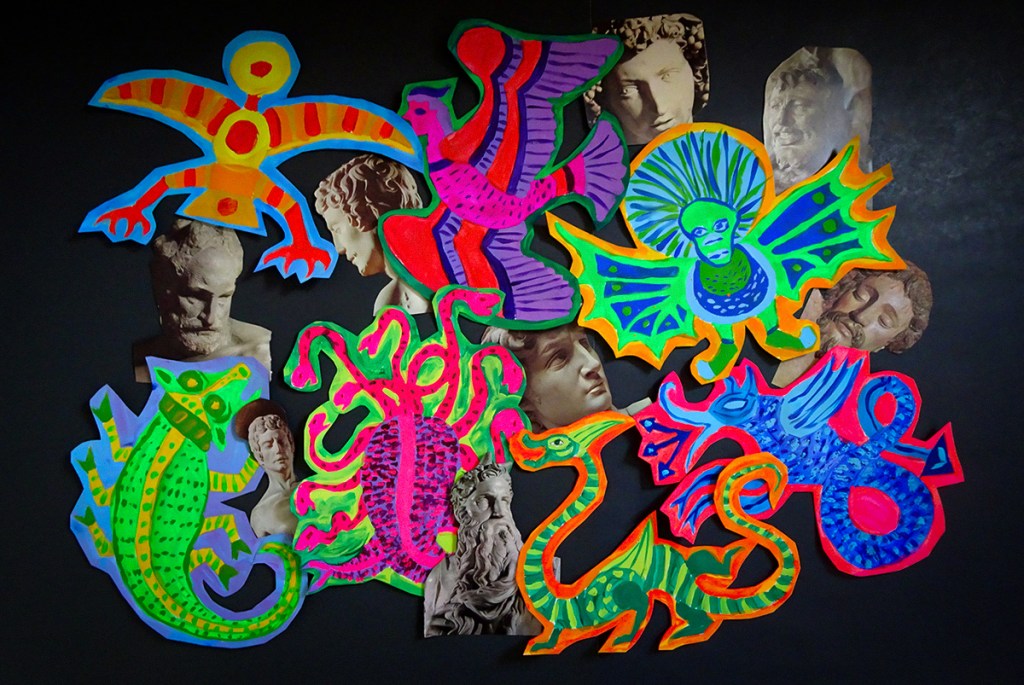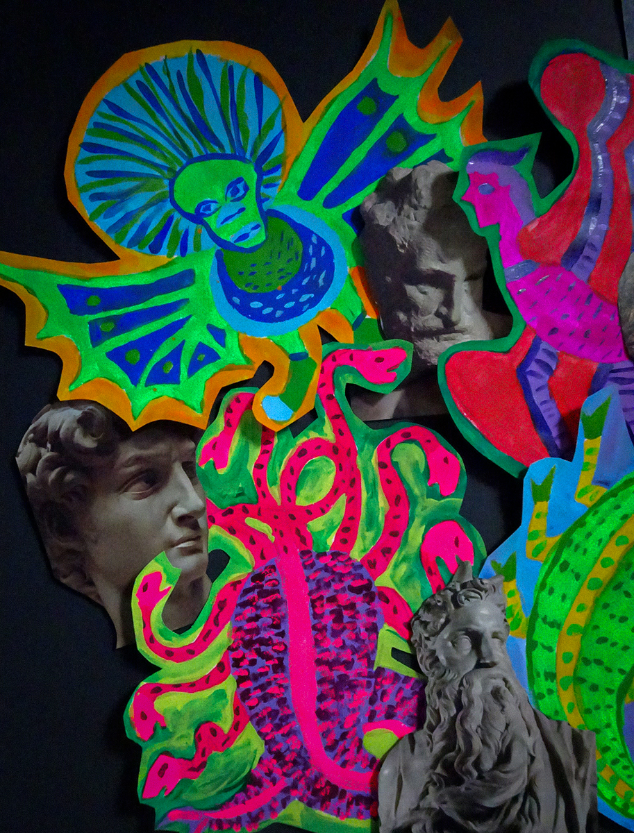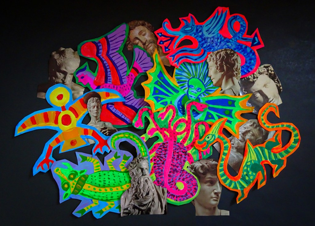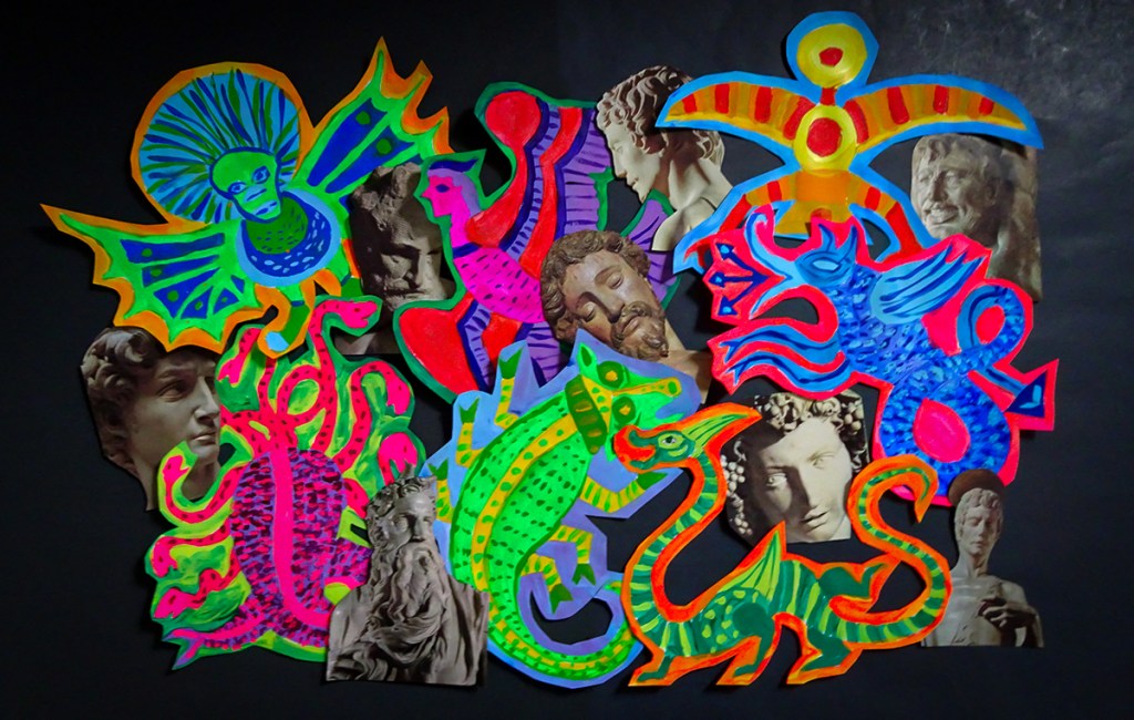 “I decided to paint some beasts in fauvist colours, inspired by Dover’s Treasury of Fantastic and Mythological Creatures, which I then cut up. I didn’t have any Donatello references, but figured Michelangelo would serve, so I scattered some of his heads among the beasts.“