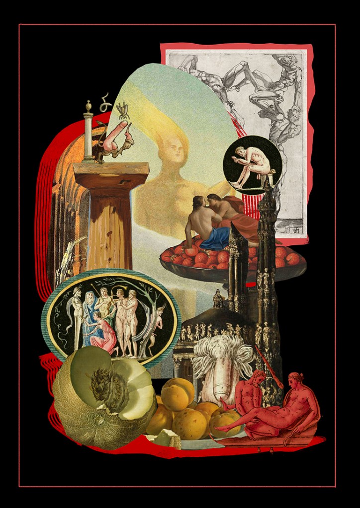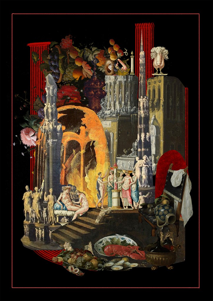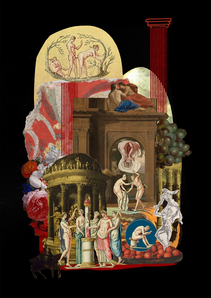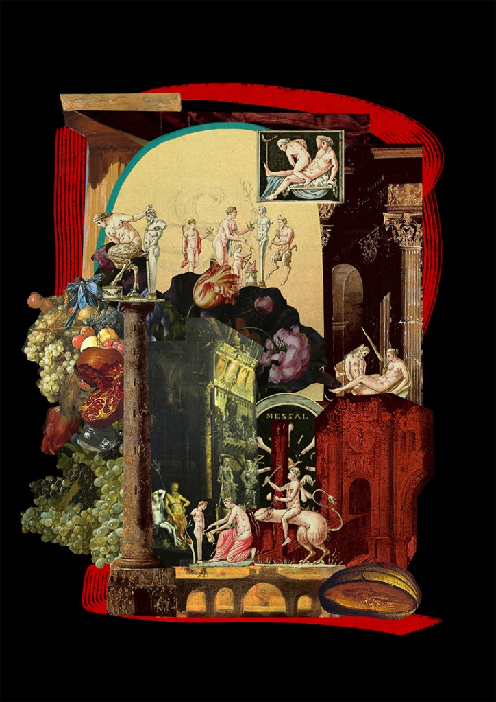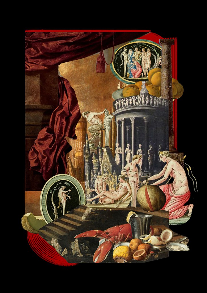 “Celebrating the debauchery and gluttony of Saturnalia, I nabbed some primordial illustrations and paintings from the public domain for a series of collages. They feature people in poses with their parts on full display, fruit and flowers strewn around Roman architecture, and plenty of vices to capture the provocative nature of the festival. I love a bit of collage and really enjoyed this one.”