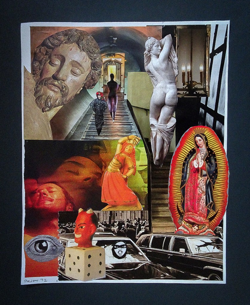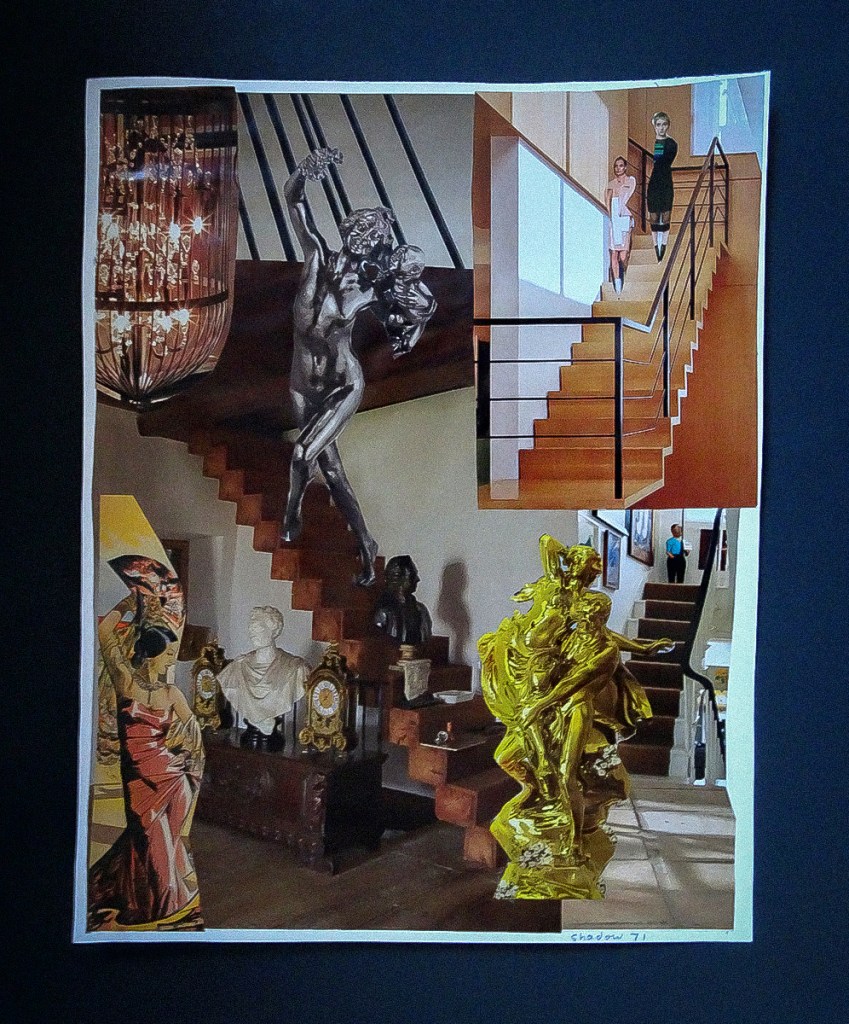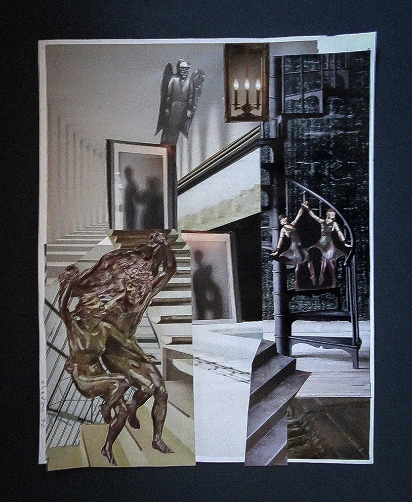 “Despite the partying, I’ve always thought of Saturnalia as having a dark, haunted, theatrical atmosphere. The giving of statues as gifts on the last day of the festivities appealed to me as a subject ripe for collage. I’ve also given a nod to the fact that this act of gifting supposedly led to its counterpart currently practised during Christmas and other solstice-inspired celebrations. I’m not sure where the staircases came from, but they make a good stage for dancing.“