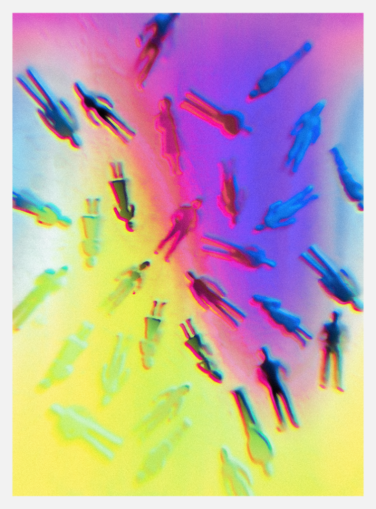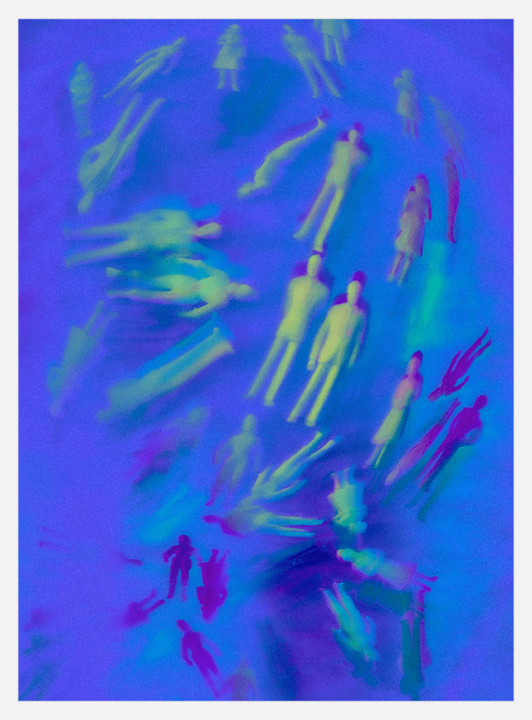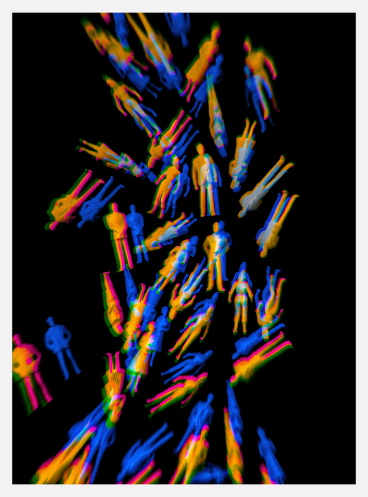 They were created simply enough; scattering the surface of a scanner with little plastic people and dropping in different backgrounds for texture (including, but not restricted to, and old Pyrex roasting dish!). I didn’t clean up the scans, but brought them straight into Premiere Pro (video editing software), as there are filters in that software for splitting RGB layers etc). In short, after some straight-ahead mucking about, I made a bunch of iterations, a selection of which I’ve included here.“