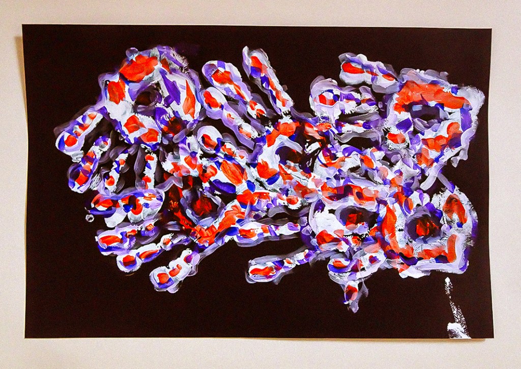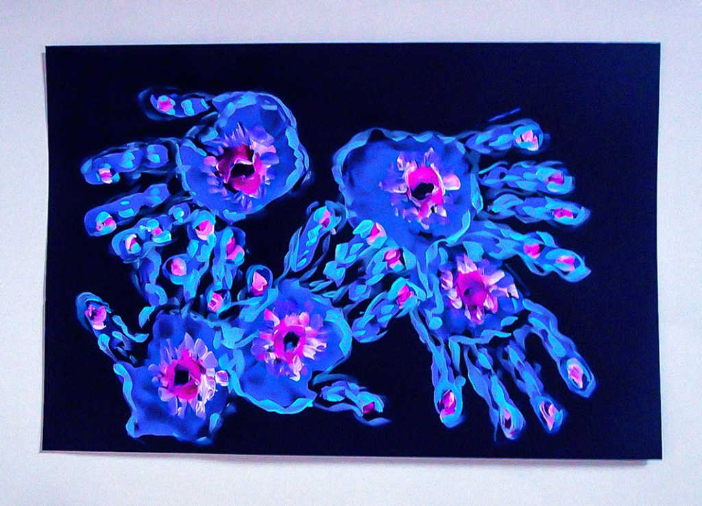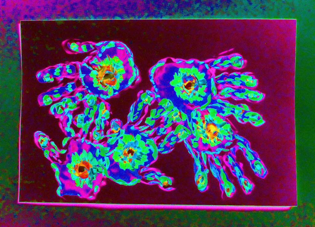 “I was immediately drawn to the hands. I did some handprints, painted on top of them, and fooled around with them in photoshop. A couple of them resemble the aura photos, but mostly I just had fun.”
