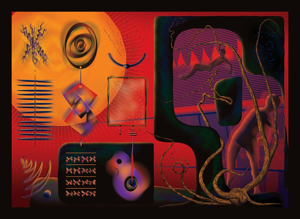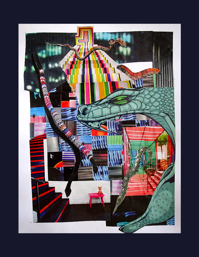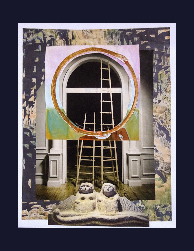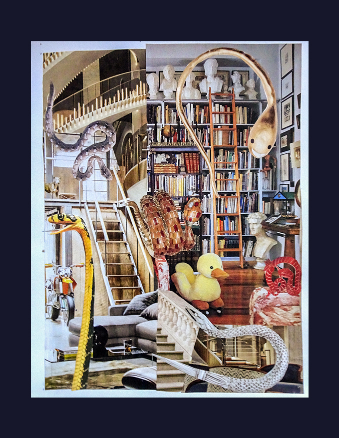“Not being too excited about the current world’s movers and shakers, I was pleased to see that the phrase was somehow associated with the game of Snakes and Ladders. So I went into my collage boxes to see what I could find. Since I didn’t have that many ladders, I used staircases in most cases — and then added some snakes. It seems somehow fitting as a reflection of these times.“