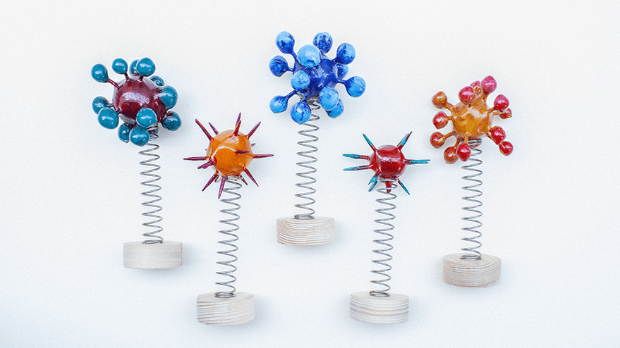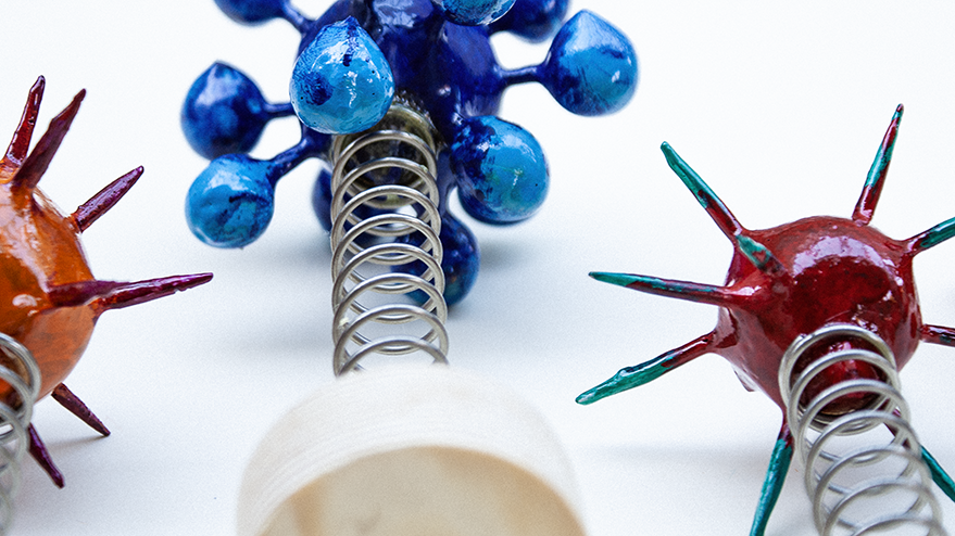 I was also thinking about those oversized models of molecules I’d seen at school and in books — tactile constructions of coloured balls and spokes. And then there are those toys you see stuck on car dashboards — nodding dogs, hula girls, swaying flowers — set moving and shaking at the slightest vibration.