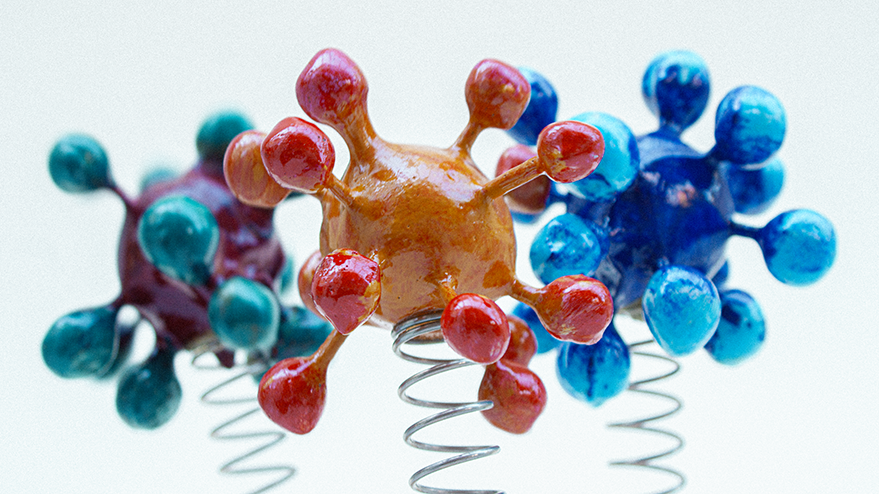 With all of that in mind, I set about making a series of molecules, pathogens, neutrons, electrons, quarks — whatever — built from balls of air-drying clay and cocktail sticks. Once painted, I glued them to some compression springs and then set them jouncing around in front of the camera. I was mostly thinking about water molecules moving from ice to liquid to vapour, so turning these solid shapes into ‘smoke’ via a few seconds of long exposure.
