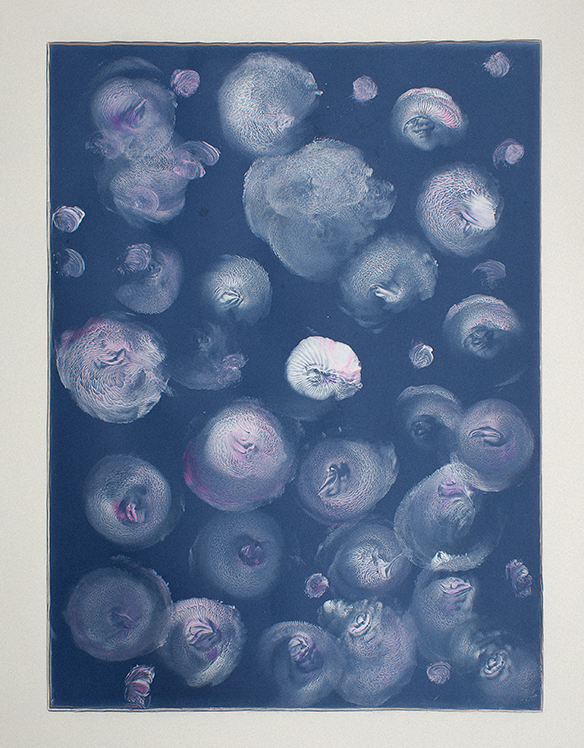 “I had never heard of these tiny organisms. I really liked the sound and meaning of their name, which is Latin and translates as ‘hole bearer’. Their shells, or tests, are located inside the cell membrane, so the amoeba-like body surrounds the hole. Images of creatures carrying holes around the oceans appeared in my mind, and after some initial amoeba doodling, I decided to grab my scissors and make cut-outs. The outcome is a Matisse-like collage that can be rearranged in infinite ways. I didn’t glue anything down, as I just can’t decide on a final version. So maybe this is what it’s meant to be: a moveable collage.”